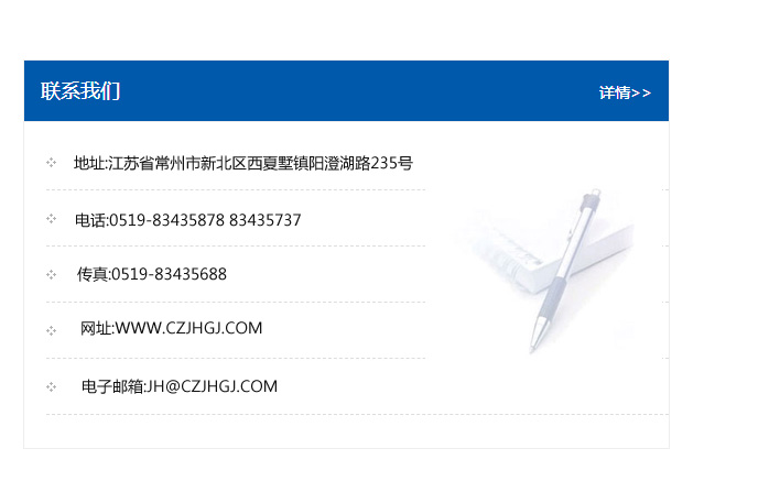 地址:常州市新北區友邦商務大廈1幢16、17層  電話:0519-85101652  傳真:0519-85112595  郵編:213022  網址:www.cz-jiayue_cn.veelinkar.com  郵箱:xiajifengaa@163.com